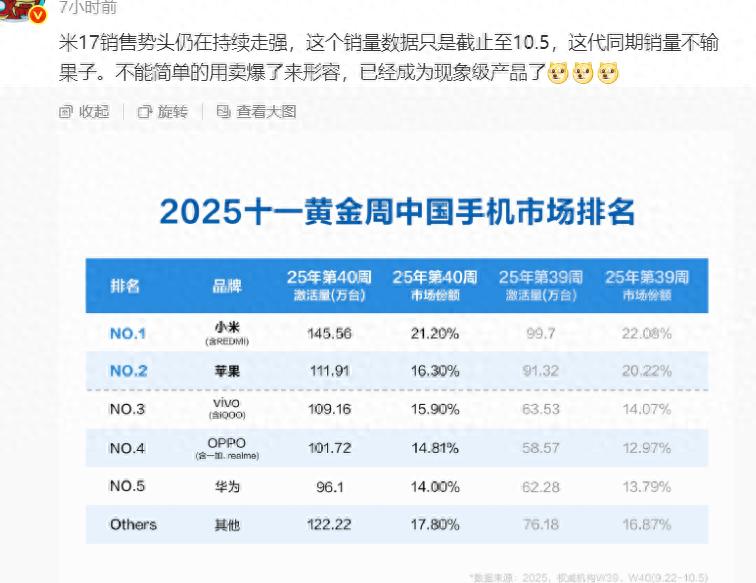 最新一周的國內手機銷量已經出爐,讓人意外的是,小米17系列的勢頭依然很猛了,可以說是不輸同期的蘋果。因為產品僅兩天,激活量就擊敗了蘋果,而且現在已經維持了兩個星期了,可以說是賣爆了,成為了國產手機的新黑馬。