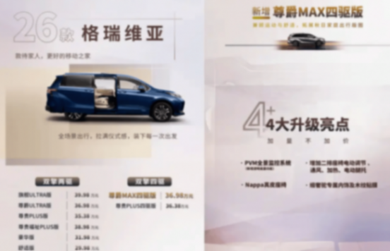 此次改款的核心亮點在于配置的全面升級。新車將配備PVM全景監(jiān)控系統(tǒng),提升駕駛安全性;座椅方面,二排座椅新增電動調(diào)節(jié)功能,并支持通風(fēng)、加熱及電動腿托,搭配Nappa真皮材質(zhì)與緞奢駝專屬內(nèi)飾,營造出更高級的乘坐體驗。木紋貼膜的加入進一步提升了內(nèi)飾質(zhì)感。標配配置同樣豐富,包括前排電動天窗、雙側(cè)電動側(cè)滑門、電動調(diào)節(jié)外后視鏡、第二排/第三排隱私玻璃、第二排遮光簾等實用功能,同時支持HUAWEI HiCar、CarPlay及CarLife手機互聯(lián),滿足多元化智能需求。