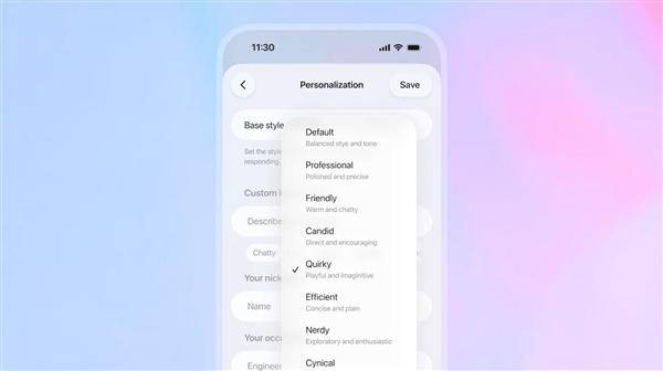 本次更新的一大亮點是個性化交互升級,在原有默認、友好、高效三種風(fēng)格基礎(chǔ)上,新增專業(yè)(Professional)、坦誠(Candid)、古靈精怪(Quirky)三種官方預(yù)設(shè),此前測試版的“書呆子”“憤世嫉俗”風(fēng)格也得以保留,覆蓋工作、日常閑聊等多元場景。