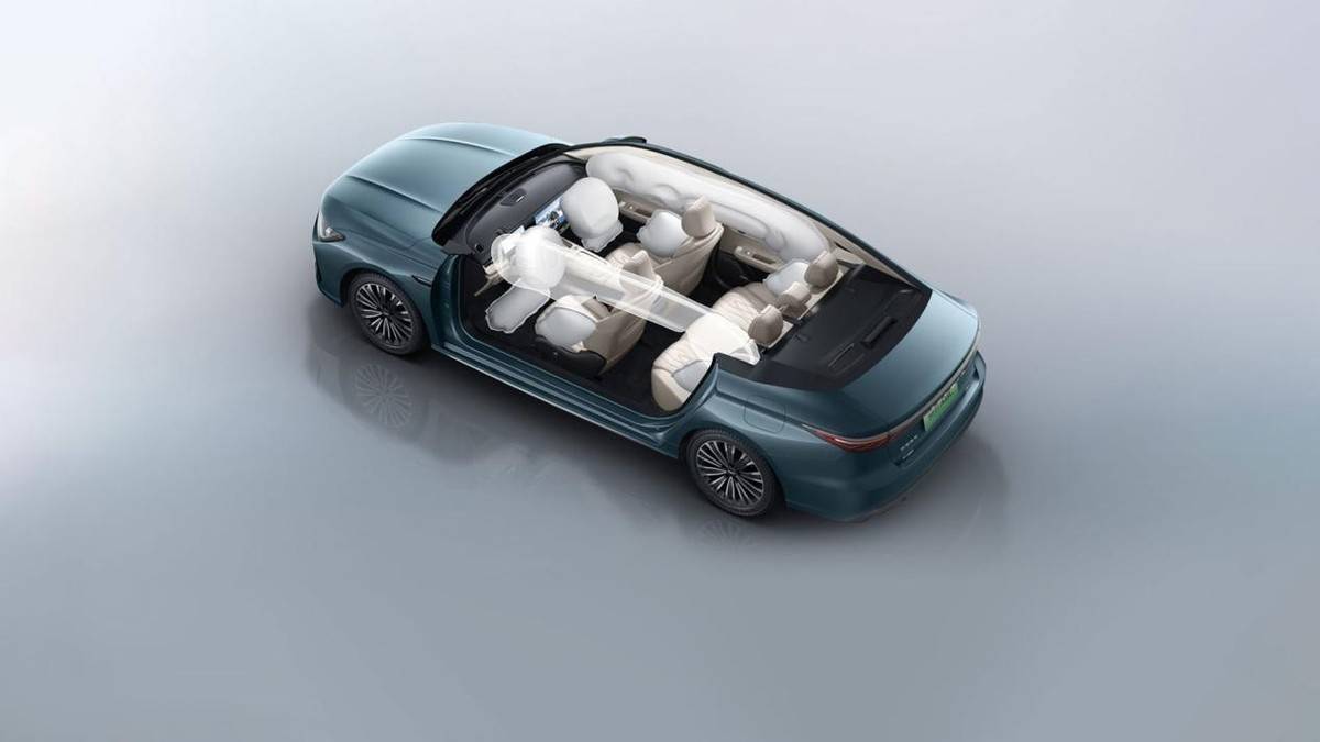 車內的被動安全配置同樣亮眼。標配10安全氣囊的配置,在中級混動轎車中堪稱“奢侈”,其中包括同級罕見的膝部氣囊與第二排側氣囊,接近2米長的側氣簾在碰撞發生時能快速展開,并且實現6秒保壓80%以上,為前后排乘客提供全方位的緩沖保護。
